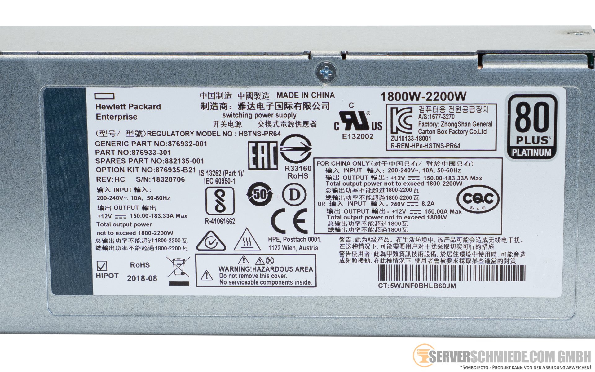 HP 2200W Netzteil PSU 80 Plus Platinum Apollo Gen10 876933-301